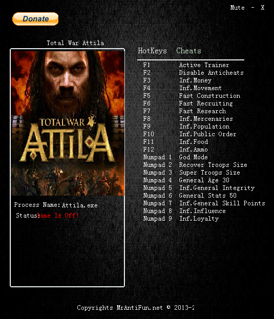 《匈奴王:全面战争》十九项修改器,更新支持最新1.3.0版本游戏,即最后的罗马人DLC版本,MrAntiFun制作,使用时先运行游戏,再启动修改器。