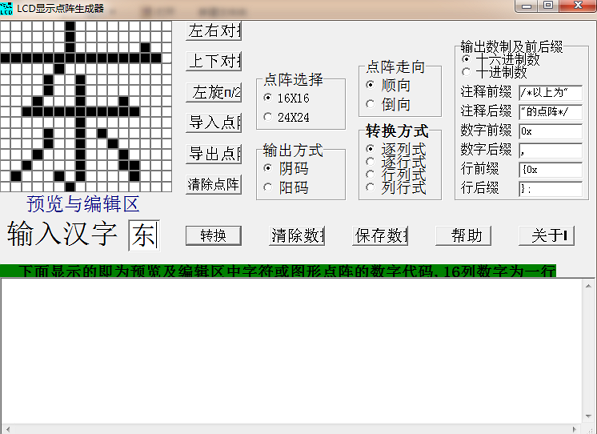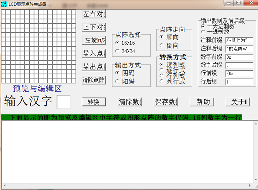 1.本程序可把预览与编辑区内(即栅格区)的点阵转化为数值代码;