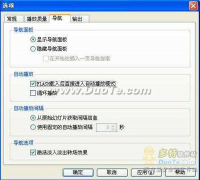 方法:单击左侧的“选项”按钮弹出“选项”设置对话框。选择“导航”选项,将下面的“导航面板”一栏中的“显示导航面板”项选中就行了。为使生成的文件能自主播放,对其进行一下相关设置。在“自动播放”一栏下选择“Flash载入后直接进入自动播放模式”。在“自动播放间隔”选项下,选择“从原始幻灯片获取间隔信息”项。假如想控制幻灯播放的间隔时间需要选择下一个选项“使用固定的自动播放间隔”,并在后面的空格内填写适当的间隔时间。