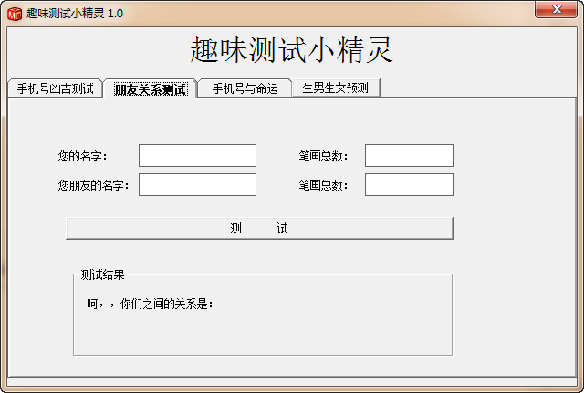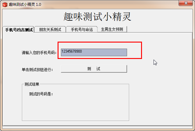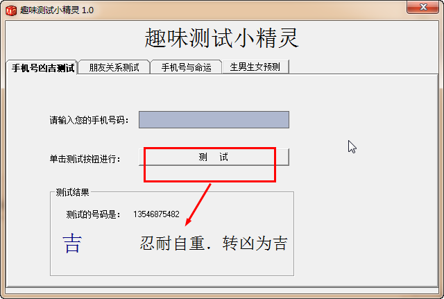 一款非常有趣的测试软件。可以进行手机号吉凶测试、qq号吉凶测试,朋友关系测试等等。准不准?嘿嘿…试试就知道了,信则有、不信则无,还不下载试试。