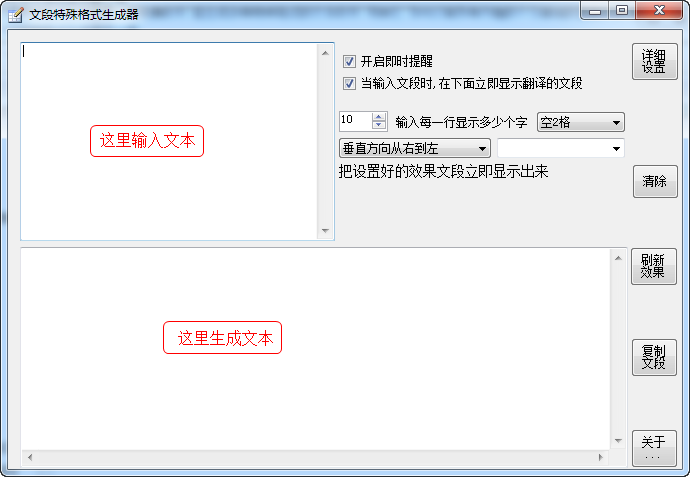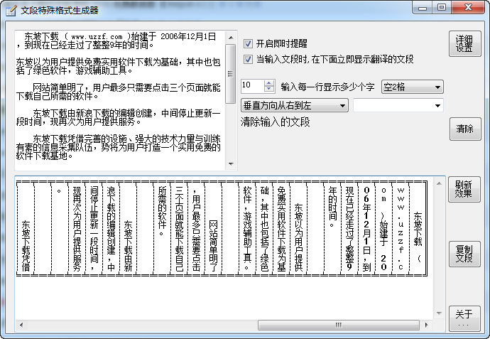 文段特殊格式生成器是一款免费软件,能生成多种特殊格式的文本软件,利用它,你可以制作有方框的十分美观的竖排文字,横排文字。