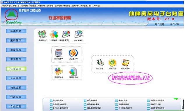 《仙峰食品电子台账管理系统》是一款面向食品经营商食品进销存一体化的优秀应用软件。该软件集目前市场上同类软件的功能优点于一身,有需要的赶紧来下载使用吧。
