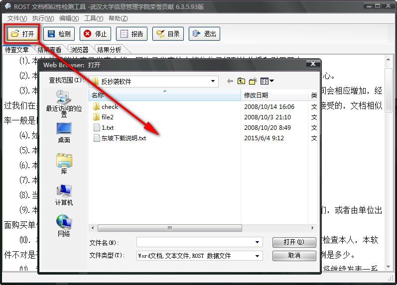 7.支持多种文件格式的文档,包括PDF、DOC、PPT、XLS、TXT等文档。 (PDF文件需另行安装ROST文件格式识别引擎)