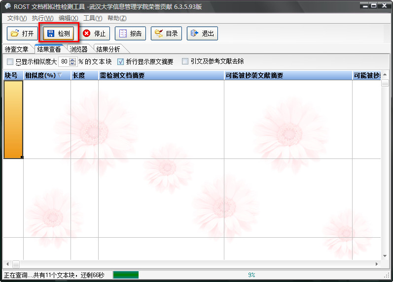 10.本软件检测结果只能作为一个参考,可以使用表格右键导出详细检查结果发送给被检查本人,本软件不对是否剽窃做结论,只是告诉你与现存文献相似度高于80%的文字比例所占文章总数比例是多少。