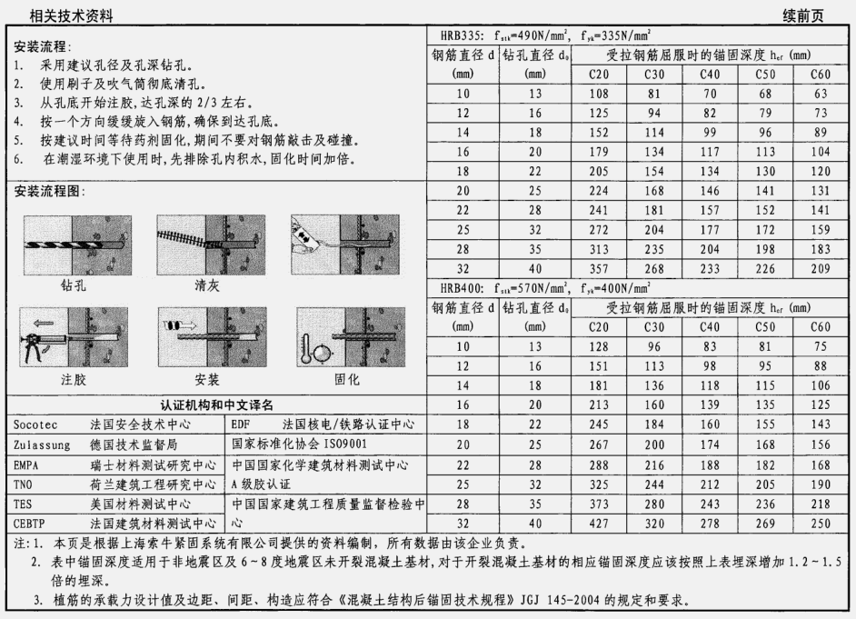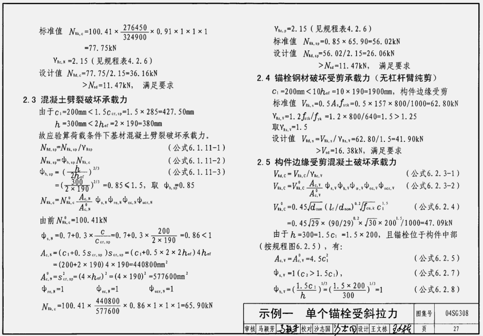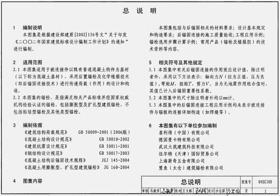 (1)适用范围:04SG308《混凝土后锚固连接构造》主要内容包括以锚栓技术为主的结构后锚固连接的设计规定、构造要求,对相关材料及施工质量验收的要求,以及后锚固连接的工程示例和计算示例等。