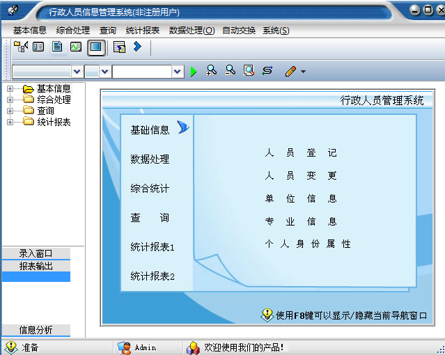 行政人员管理系统在职人员分类统计包括归属行政区域、性别、民族、所属行业、个人身份属性、所任职务、职务类别、单位名称、政治面貌等进行统计,有需要的赶紧来下载使用吧。