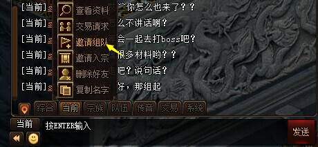 方法一:在聊天窗口中鼠标左键点击对方角色名,在菜单中选择“邀请组队”,对方同意后,组队完成。