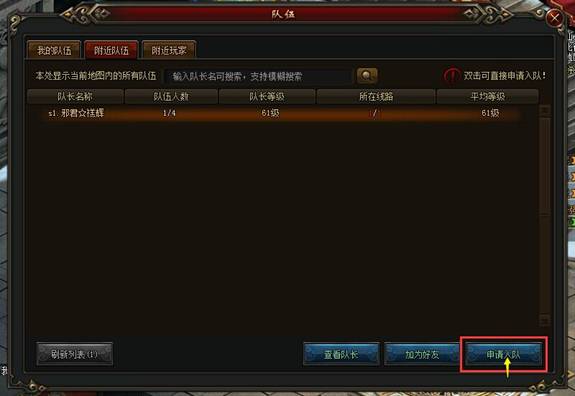 点击游戏菜单界面的【组队】或使用快捷键P打开组队界面,在【附近队伍】处就可以看到周围的其他队伍,选择队伍后点击【申请入队】按钮,待队长同意后,组队完成。