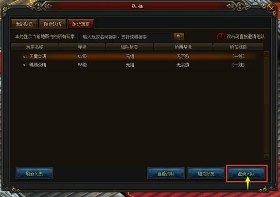 方法二:点击游戏菜单界面的【组队】或使用快捷键P打开组队界面,在【附近玩家】处就可以看到周围的其他玩家,点击【邀请入队】按钮,对方同意后,组队完成。