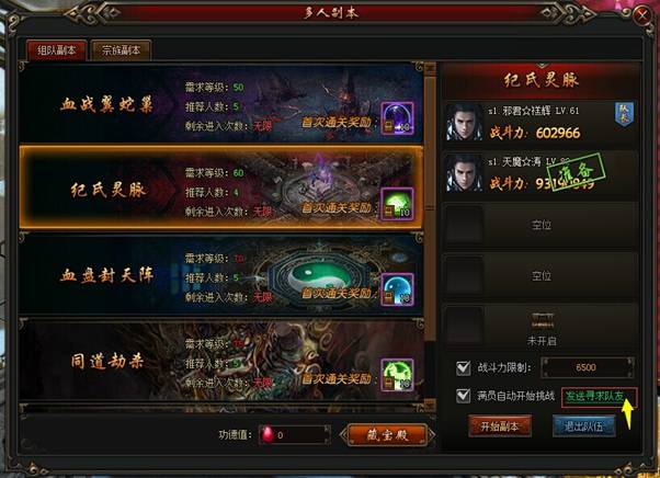 莽荒纪多人副本组队,是通过副本界面来创建队伍,全服组队。这是我们的一大亮点不要怕组队没有人,就怕你看到高战力队长的队伍想加入却被提示:“人满了”。