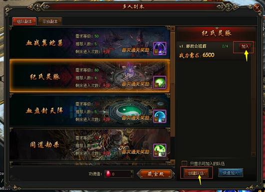 你可以选择“加入”,或者“创建队伍”,来开始你心仪的副本。
