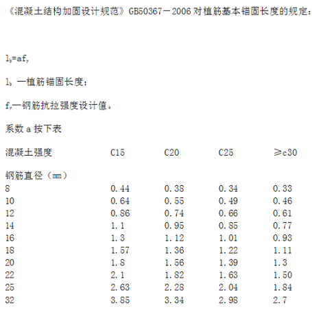 植筋是一种不得已而采用的施工工艺,如由于建筑功能变化、设计变更、结构加固改造等情况下使用的一种工艺,它不是应该提倡的主流技术,因为它的锚固强度依靠锚固胶而不是钢筋与混凝土之间的粘结力,并且锚固胶代价不菲,虽然植筋长度比钢筋锚固长度短但造价却比正常的钢筋混凝土锚固要高。一些施工单位采用国内生产的劣质锚固胶根本达不到锚固强度。我经常在施工现场看到植入墙内拉结筋可以轻松用人力拉下来,根本起不到拉结的作用,形成安全隐患和抗震薄弱环节。 植筋使用的粘结剂分为两类:以水泥为主要成份,与微膨胀剂组成的普通粘结剂和以聚氨酯甲基丙烯酯等组成的高性能粘结剂。锚固胶的性能应通过专门的试验确定,施工时不得随意添加掺料。“当被植筋的混凝土结构可提供足够锚固长度,且受静力作用时,可采用普通粘结剂;若被植筋的混凝土结构受动荷载作用,或其构造上难以增大锚固长度而又要求所植钢筋不致发生脆性破坏时,应选用高性能粘结剂。”如使用环氧基锚固胶,锚固胶的性能指标应符合《混凝土结构后锚固技术规程》JGJ 145-2004的规定。