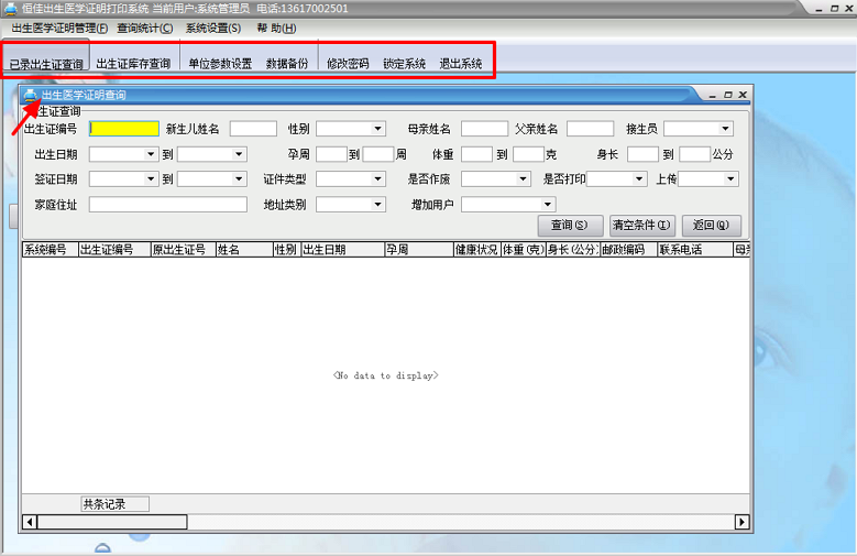 完善的用户管理,可设置不同操作人员的管理权限,保证数据操作安全。 出生证明格式套打,按照卫生部颁发出生证明格式打印。可以适用于各种A4以及A3打印机,尽量适用单位现有打印机,不需重新购买,节省单位成本。自定义高级查询和排序功能,并且能生成各种报表,也可以按照用户的需求定制开发报表。