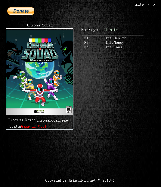 MrAntiFun版色彩特技小分队三项修改器1.02对应游戏1.02版本使用,有无限生命、无限金钱和无限粉丝三项功能,让你在游戏里可以更加肆意的任性。