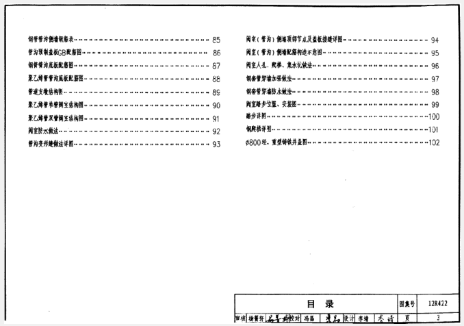 12R422《混凝土模块砌体燃气阀室及管沟》为新编国家建筑标准设计图集。本图集适用于抗震设防烈度为8度(含设计基本地震加速度为0.15g和0.30g)及8度以下地区,设计覆土厚度为0.3~1.5m的城镇室外燃气阀室及管沟的设计、施工及安装工程。燃气管道的输送介质为天然气,设计温度为常温,钢制燃气管道的设计压力为2.5MPa、1.6MPa及以下,管径范围从DN100~DN700;聚乙烯燃气管道的最大允许工作压力不大于0.7MPa,管径范围DN63~DN315。结构的设计使用年限为50年。