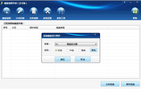 打开磁盘加锁专家软件,点击软件窗口右侧下方的添加磁盘按钮,然后在添加磁盘进行加锁窗口选择您需要加锁的磁盘分区和选择需要加锁的级别后点击确定按钮就可以了。
