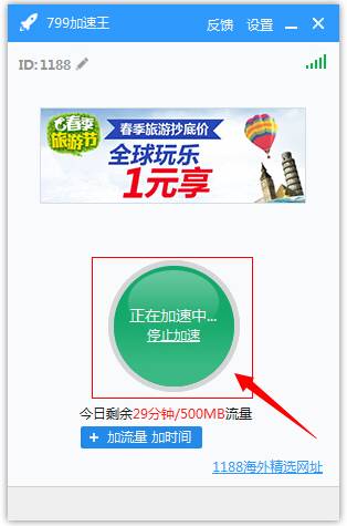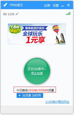 红框中为您今日免费体验剩余时间,默认每天免费体验时间为30分钟或流量达到500MB,进度条归零后将自动断开链接。点击 加流量 加时间 参加活动将会增加对应的时间/流量。点击“停止加速”按钮即可停止加速,剩余体验时间也会保留。