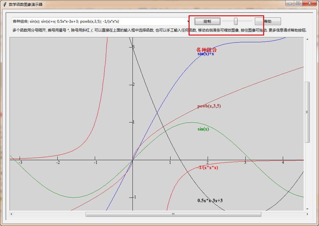 数学函数图象演示器,能够帮你生成数学函数的图画出来,帮助你学数学函数,多个函数用分号隔开, 乘号用星号 *, 除号用斜杠 /, 可以直接在上面的输入框中选择函数, 也可以手工输入任何函数, 移动右侧滑条可缩放图像, 按住图像可拖动. 更多信息请点帮助按钮.