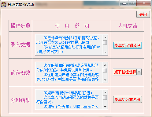 经过几年的内码修正与完善,分班结果更趋平衡更具权威。操作上,只要将学生的姓名、性别、学科成绩等信息数据录入或复制到专用电子表格文件中,老舅爷自动把分班名册和相关统计数据显示在电子表格上,供排版和保存及打印。效果上,老舅爷克服了传统S型分班方法的不足,能同时兼顾诸多细节。既考虑到各班学生数和男女性别的平衡性,又考虑到学科总分成绩的均衡分布,更细致到各单科成绩均分和各层面学生分布的一致性,甚至能预测成绩瘸腿学生的发展趋势,确保同轨班科之间的平等性。本老舅爷来自于多年实践,经过若干教育教学名校一学年循环或多学年循环验证,划分两个班级以上和考虑两科成绩以上的因素以及分层面考虑分班的平衡性时,舅爷绝对强。
