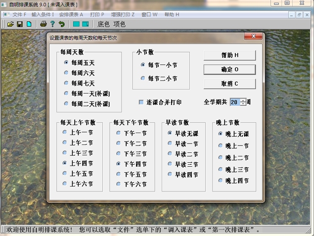 10、可对每周上课天数进行设定和更改,可对每天早晨、上午、下午、夜晚的上课节数进行设定和更改,同时又不影响已排好的课程表中任何课程的节次位置。