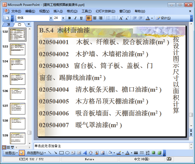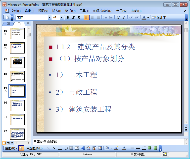 这是一份由572页组成的建筑工程概预算PPT教案课件,该ppt详细介绍了建筑工程概预算相关内容,比如建筑工程定额原理、施工图预算的编制方法、建筑产品及其价格、 工程造价计价依据、建筑工程预算的审核和工程结算等等,如果你需要一份建筑工程概预算ppt教程课件的话,那就赶紧来东坡下载站将这份免费绿色版建筑工程概预算PPT教案课件收入囊中吧!相信它不会让你失望的哦!