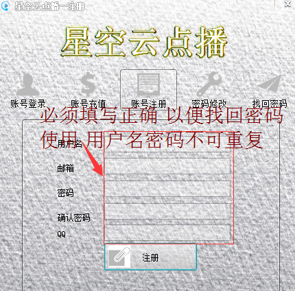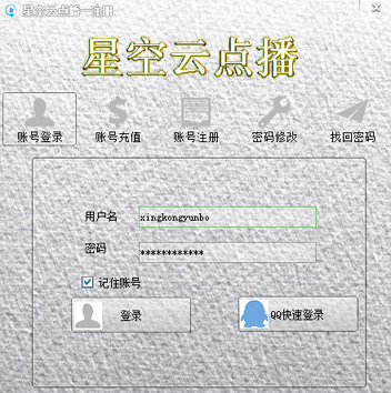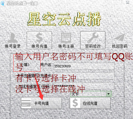 2.账号充值,输入你在软件上注册的账号密码 有卡号选择卡号充值 没有卡号请选择在线充值”