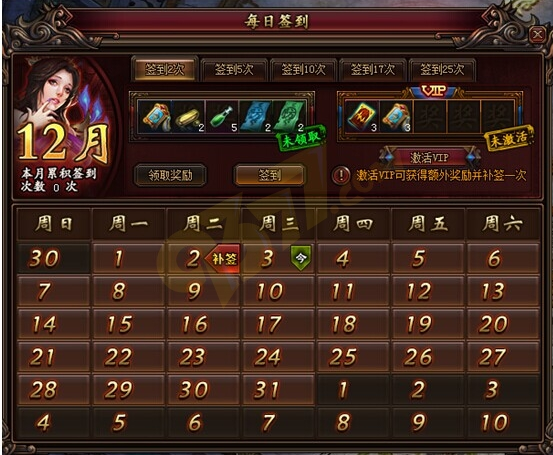 连续签到次数越多,可以领取的奖励越多,VIP玩家还可以领取额外的VIP签到奖励。此外游戏中还提供补签的功能,这对于那些忘记签到的玩家来说绝对是福音,只需花费很少的元宝就能进行补签,连续签到大奖近在咫尺!