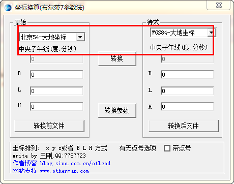 坐标转换软件可通过取两幅图纸同名点4个解算了布尔莎七参数,进而对其他坐标进行转换。由于图纸是通过软件进行转换的,所以参数的解算通过平差后发现的中误差均为0.经测试,取80坐标系图纸任意点,通过七参数换算和坐标转换后,与54坐标系图纸完全一致。