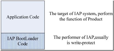 首先简单介绍一下STM32的IAP。IAP(In-application-programming),即在应用中编程。有了它,产品发布之后,仍然可 以方便的升级固件,而不需要拆机并用JTAG等方式更新程序。IAP系统的固件一般有两部分组成,IAP BootLoader Code和Application Code,如下图所示。