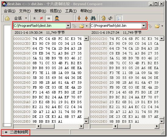 dest.bin就是我们最终需要的合并完成的文件。将它与第一种方法合并的文件dst.bin对比一下,如下。