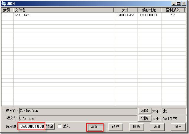 首先,添加第一个文件1.bin,其地址为0x0000,所以,偏移量设置为0x00000000,设置完偏移量后点击“添加”按钮。