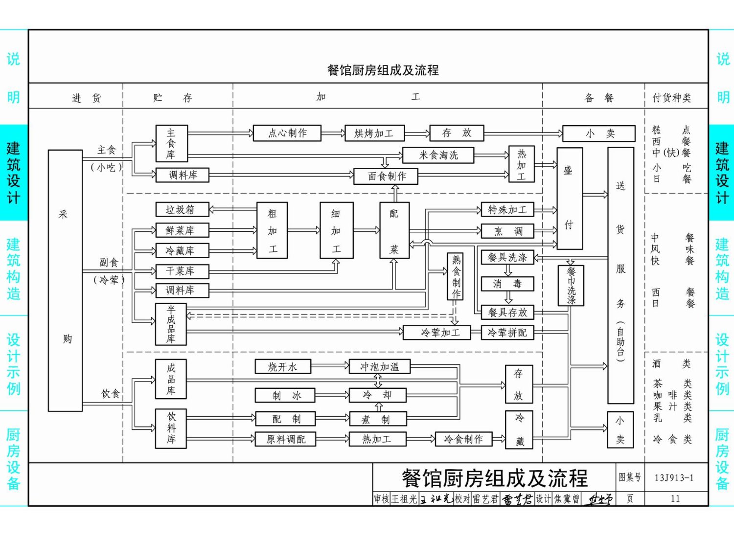 本图集内容主要包括民用与工业建筑的公共厨房设计、相关建筑构造和主要厨房设备。公共厨房设计包括餐馆厨房设计、饮食店厨房设计和食堂厨房设计。建筑构造包括楼地面、排水沟、吊顶、炉灶、排气道、洗池、操作台等做法。厨房设备包括炉灶系列、电磁炉系列、蒸饭柜系列、调理台柜系列、储物柜货架系列、洗刷系列、制冷系列、车类系列、食品机械系列、消毒及西餐设备系列。图集由说明、名词解释、设计要点、构造详图、设计示例及设备图片等部分组成。