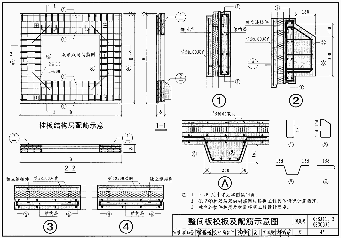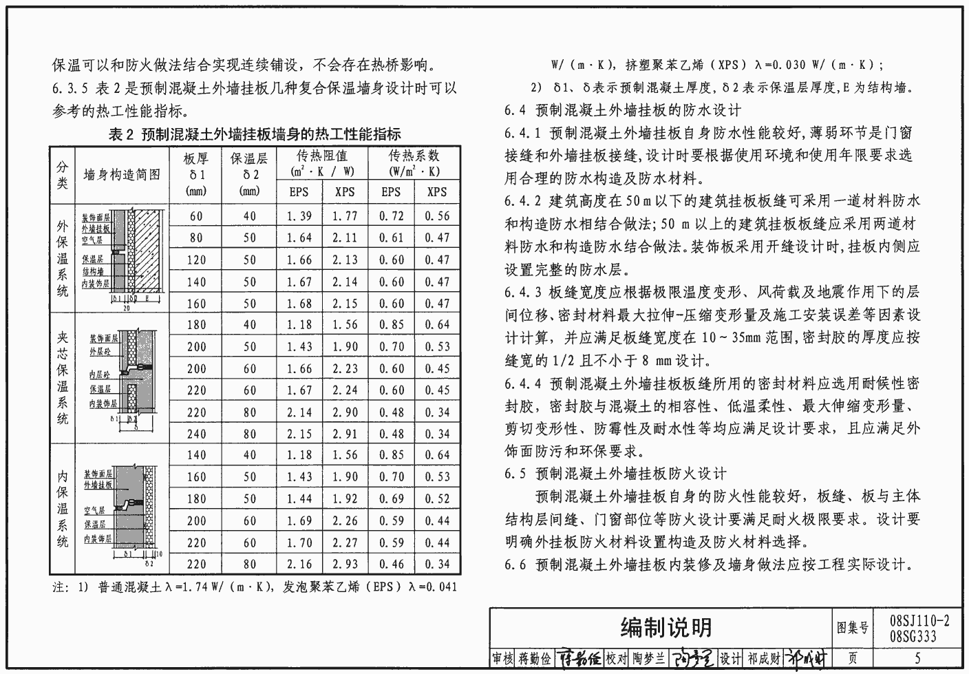 本图集包括建筑专业和结构专业两部分,其中建筑方面提供了外墙挂板热工性能指标、保温做法、防水做法、建筑墙身剖面详图等内容,直接提供设计人员选用;结构方面提供了构件及连接的设计原则、结构连接构造、连接件和预埋件构造、典型板配筋示意等内容,设计人员可选用合适的连接构造形式并经过计算完成墙板、预埋件、连接件的设计。