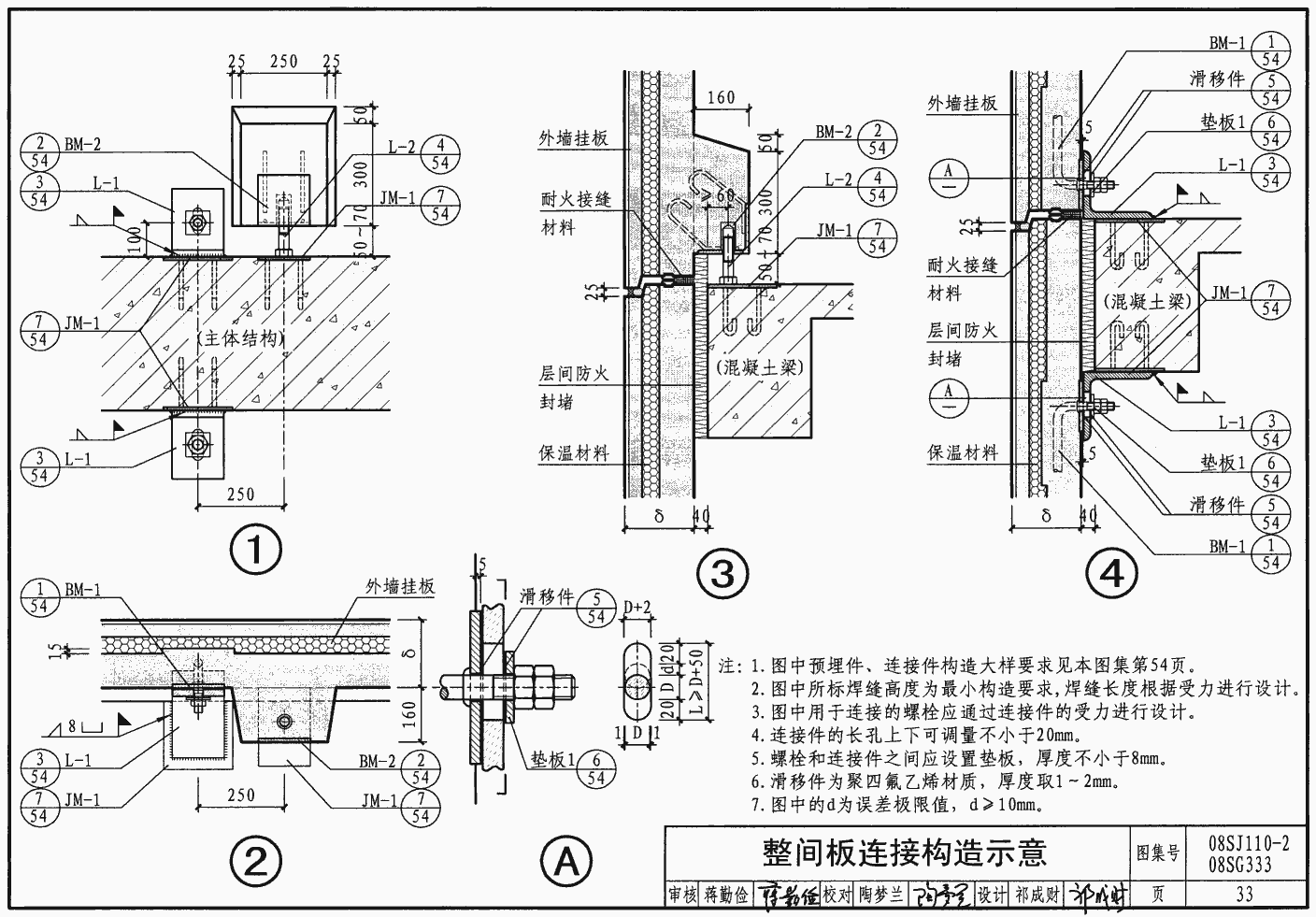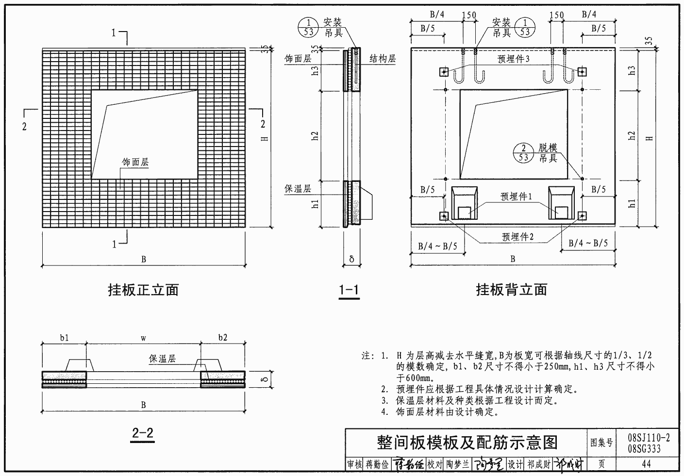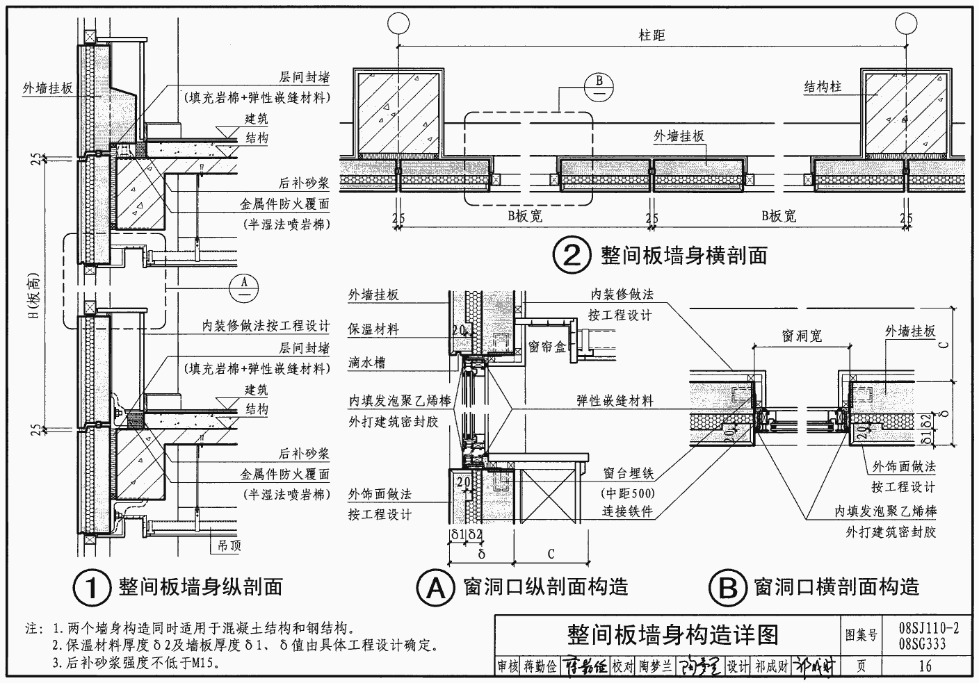08SJ110-2 08SG333《预制混凝土外墙挂板》国家建筑标准设计图集中外墙挂板集外墙装饰面(可为面砖、石材、涂料、装饰混凝土等形式)、保温于一体,工厂生产一次成型,省去了建筑外装修的环节。按功能定位可分为围护板系统和装饰板系统,其中围护板系统按建筑立面特征又划分为整间板体系,横条板体系、竖条板体系。适用于抗震设防烈度8度及以下地区、100m以下高度民用建筑及一般工业建筑,二a类环境类别的外墙工程。