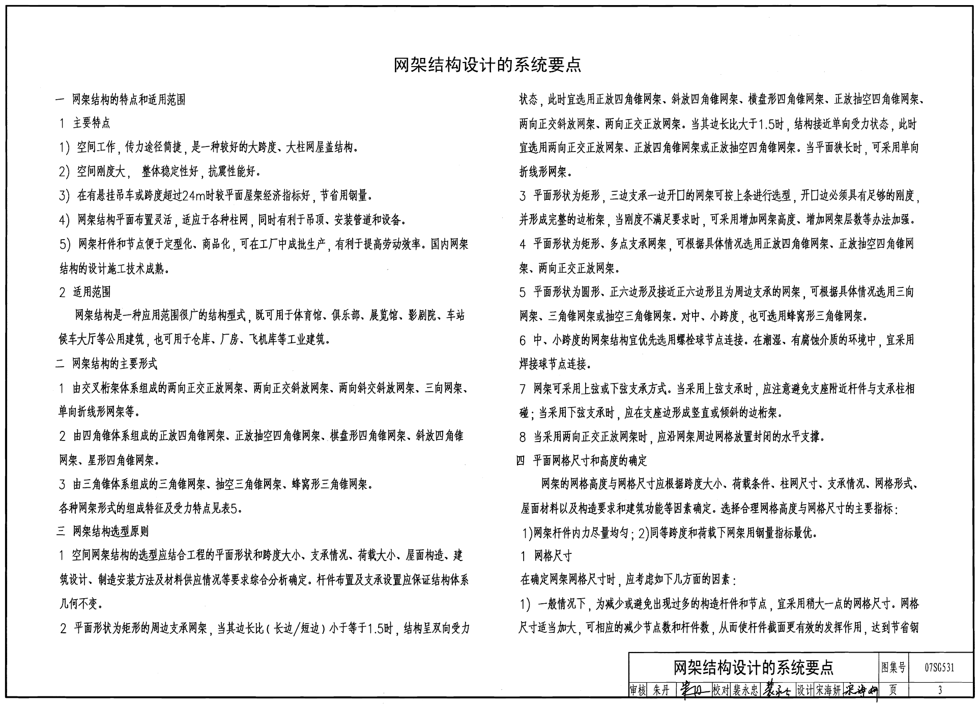 07SG531钢网架结构设计图集(以下简称为07sg531图集)是一份适用于非抗震设防及抗震设防烈度≤9度地区的一般工业与民用建筑,如单层厂房、体育场馆、展览馆、飞机库等的网架屋盖结构的参考图集。本节内容东坡小编为大家整理带来的是一份pdf格式高清电子版07sg531图集,图集共由49页组成,内容完整免费,欢迎有需要的朋友前来下载,以下是关于该图集的相关介绍,希望对大家有所帮助!