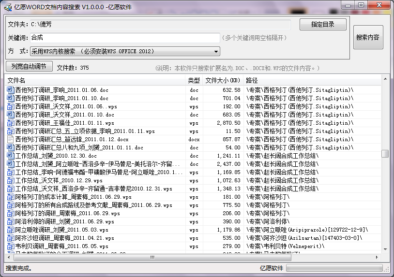 1、搜索指定目录中所有DOC文件、DOCX文件、WPS文件和TXT文件的文本内容,避免一个一个打开文件搜索的麻烦;