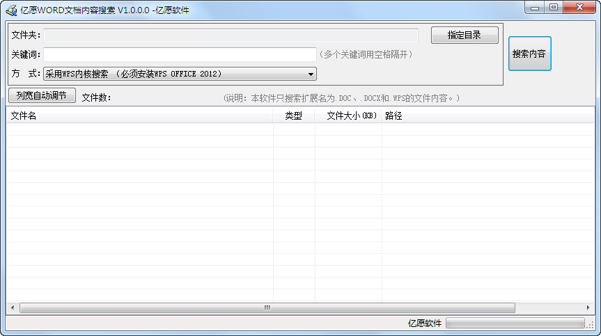 亿愿WORD文档内容搜索工具是一款绿色免费的word内容搜索工具,能够搜索指定文件夹中所有的*.doc、*.docx、*.wps、*.txt等文档中的文本内容。