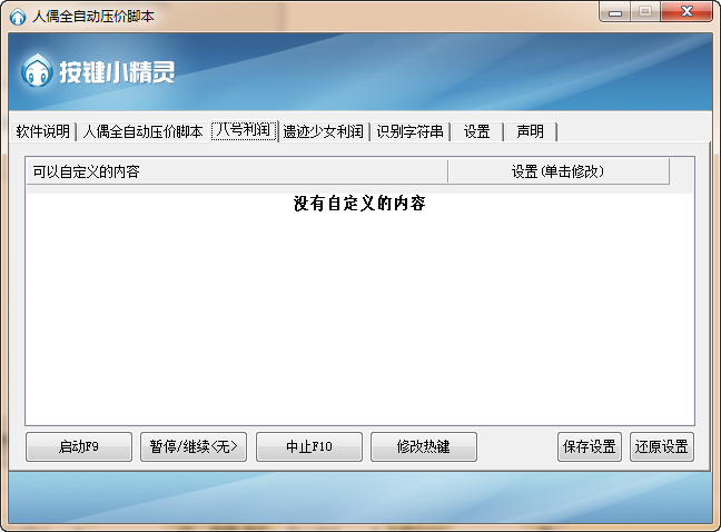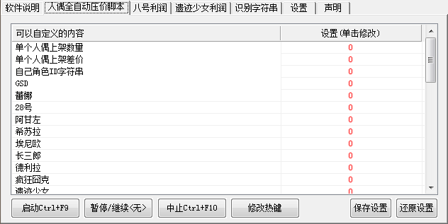 人偶全自动压价脚本适用于地下城与勇士玩家使用的dnf人偶辅助,主要提供人偶上架压价功能。人偶全自动压价脚本启动地点在赛利亚仓库,欢迎有需要的朋友下载使用!可以用上面识别字符串选项卡来完成,自动复制自己字符串,然后在自己角色ID字符串 选项后面添加进去既可以 格式为:”自己的字符串”,下面就是人偶价格了,根据各大区价格来设置。
