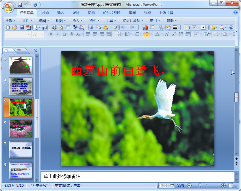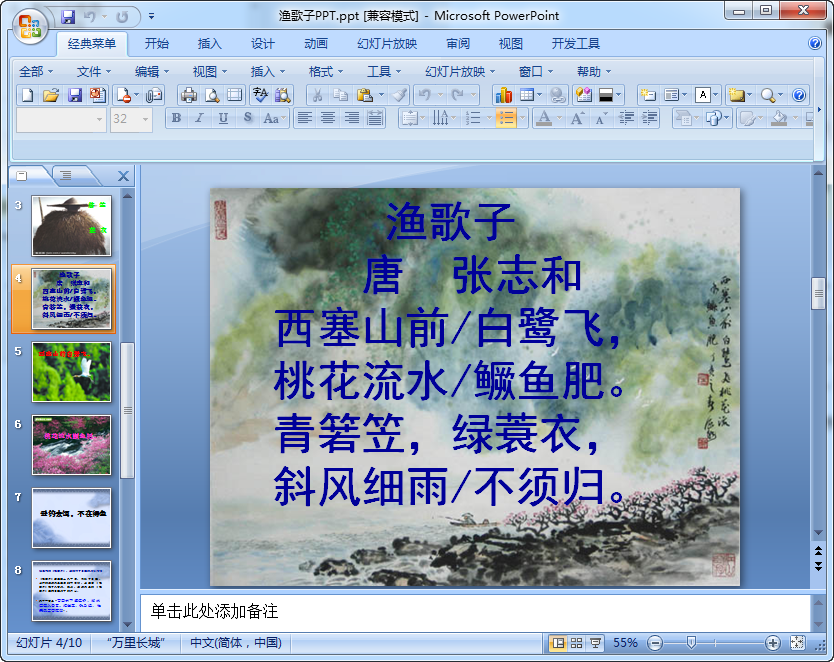 渔歌子PPT课件是一款特别适用的小学五年级ppt课件。十分的实用哦。而且有图文详解哦。替换起来非常的方便,让同学们听起课来,更加的有感觉哦。