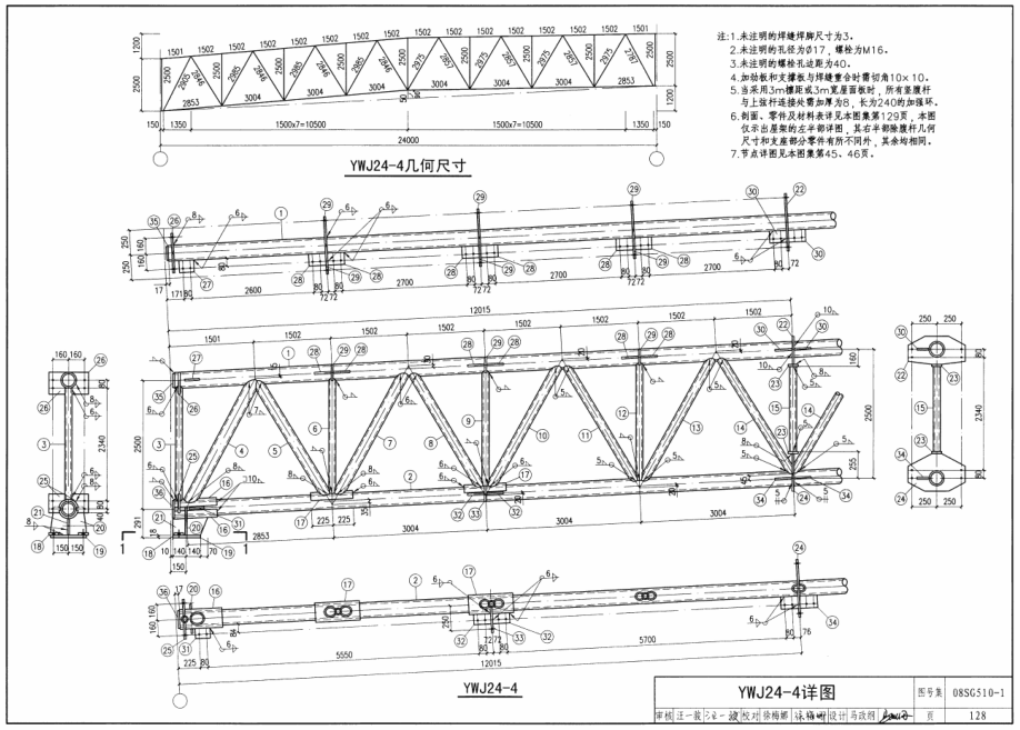 本图集适用于非地震区及抗震设防烈度≤9度的地区、跨度在18~30m、屋面采用压型钢板、夹芯板或发泡水泥复合板、截面为圆钢管、方钢管的平行弦钢屋架。屋架下弦标高≤20m;起重机工作级别A1~A5,额定起重量≤50t;桁架间距及柱距为6.0m、7.5m、9.0m的单层工业与民用建筑。内容包括屋架详图、支撑布置及其构件详图、檩条和拉条的布置、檩托位置图(檩条选用详见标准图《钢檩条、钢墙梁》)、安装节点详图(包括多跨单坡和多跨双坡的安装详图)等,便于设计、施工人员选用。
