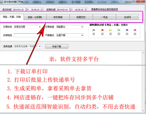 批量下载订单,批量打印快递单、发货单、拿货单、批量发货、扫描发货,进销存同步多店铺库存和自动出库,批量评价,插旗备注,中差评管理,客户管理、促销回访、发货通知等,二维码打印、各快递热敏打印、菜鸟电子面单打印等,并提供方便的管理界面。目前已有淘宝、天猫、阿里巴巴、京东、1号店、拍拍等平台1.5万左右用户使用