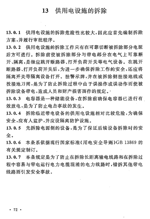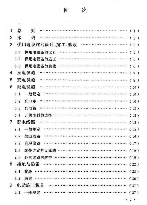 本规范共13章和1个附录,主要技术内容包括:总则,术语,供用电设施的设计、施工、验收,发电设施,变电设施,配电设施,配电线路,接地与防雷,电动施工机具,办公、生活用电及现场照明,特殊环境,供用电设施的管理、运行及维护,供用电设施的拆除等。本规范适用于一般工业与民用建设工程,施工现场电压在10kV及以下的供用电设施的设计、施工、运行、维护及拆除,不适用于水下、井下和矿井等工程。