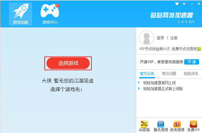 1、首先启动加速器,随后点击“选择游戏”按钮,如下图所示