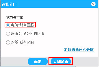 3、选择游戏后会弹出“选择分区”窗口,根据所玩游戏分区选择,这里我们选择“电信-所有区服”,然后点击“立即加速分区”(注意:外服游戏无需选择分区)如下图所示: