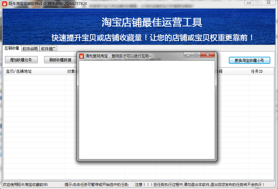 1、开始互刷前。软件会提示您登陆淘宝,软件并不会收集您的账号信息,所以登陆将从淘宝登陆窗口进行登陆,登陆成功后软件开始工作