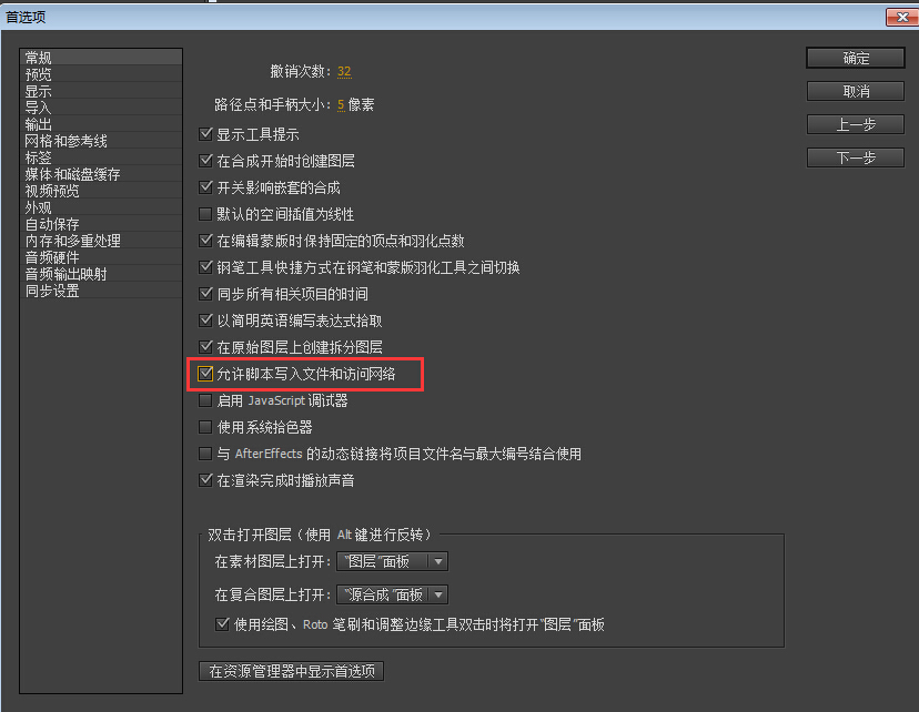 2.进入AE,选择编辑/首选项/常规>允许脚本访问网络。