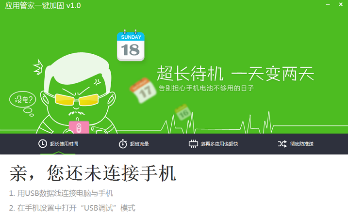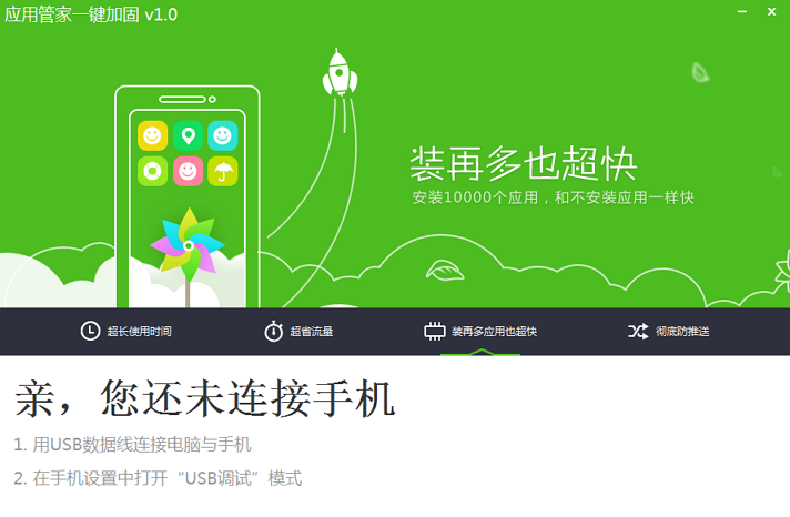 对手机里已经安装的应用进行技术处理,彻底释放手机内存,合理分配和最大化手机运行内存性能,让手机永不卡顿,即使安装再多的应用也一样快,彻底提速,防止后台服务偷偷运行,进而达到防病毒,防骚扰推送,防手机不用时应用偷偷联网的效果。安装“应用管家”不仅有效延长手机待机时间,而且节省大量流量。