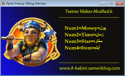 《疯狂农场:维京英雄》四项修改器,基于1.0版本游戏,Abolfazl.k制作,具有无限金钱,无限计时等功能,使用时先运行游戏,再启动修改器。