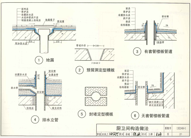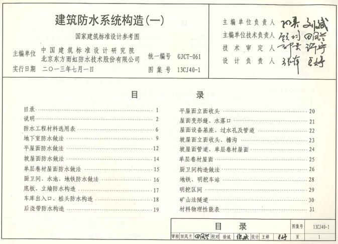 13CJ40-1《建筑防水系统构造(一)》是以北京东方雨虹防水技术股份有限公司的系列防水产品在建筑屋面、地下室、卫生间等防水工程中的应用技术为依据编制的国家建筑标准设计参考图。