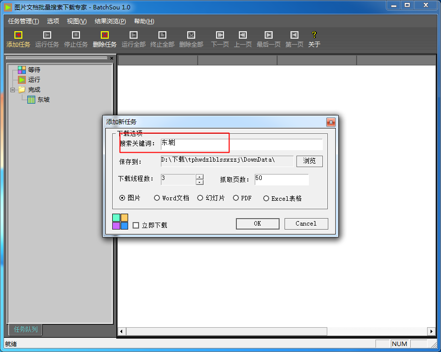 图片文档批量搜索下载专家是一款绿色免费的批量下载文件的工具,借助百度搜索引擎,将需要的搜索请求提交到百度上,将搜索得到的结果批量下载下来并保存在本机目录下。